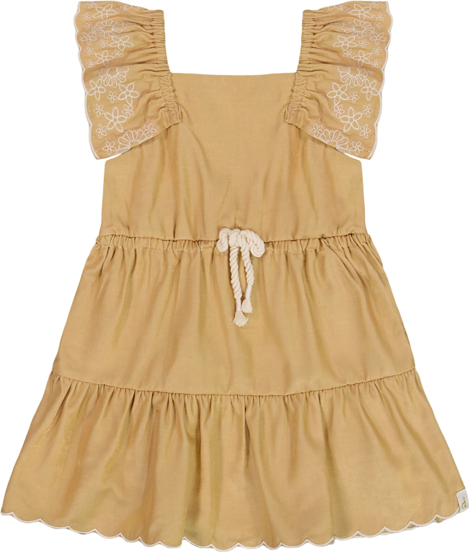 Perfect for parties, family outings, and casual celebrations, our Chambray Dress with Embroidery Striped adds instant style to any little girl's wardrobe. This lightweight woven dress features a tiered silhouette with flutter sleeves, a square neckline, an elastic waist with a rope tie, and a small cutout detail in back. Embroidered flowers and a scalloped hem make it extra-sweet!