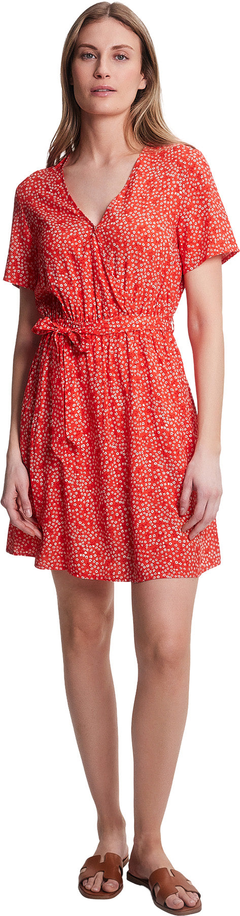 • Short sleeve faux-wrap dress with crossover neckline