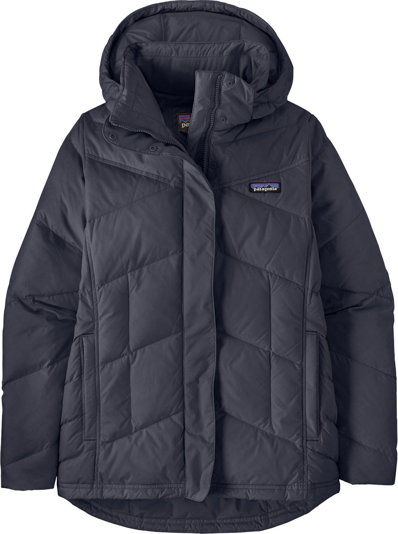 Strategically sized baffles and princess seams create the women's DOWN WITH IT Jacket’s feminine silhouette, defying down’s billowy reputation. This Patagonia jacket's shell is made from 100% recycled polyester treated with a DWR (durable water repellent) finish and insulated with 600-fill-power 100% Recycled Down (duck and goose down reclaimed from down products). The insulated, removable hood secures with sturdy plastic snaps and a wind flap conceals the front zip. Welted, on-seam handwarmer pockets have zip closures. An interior zip chest pocket secures valuables.
