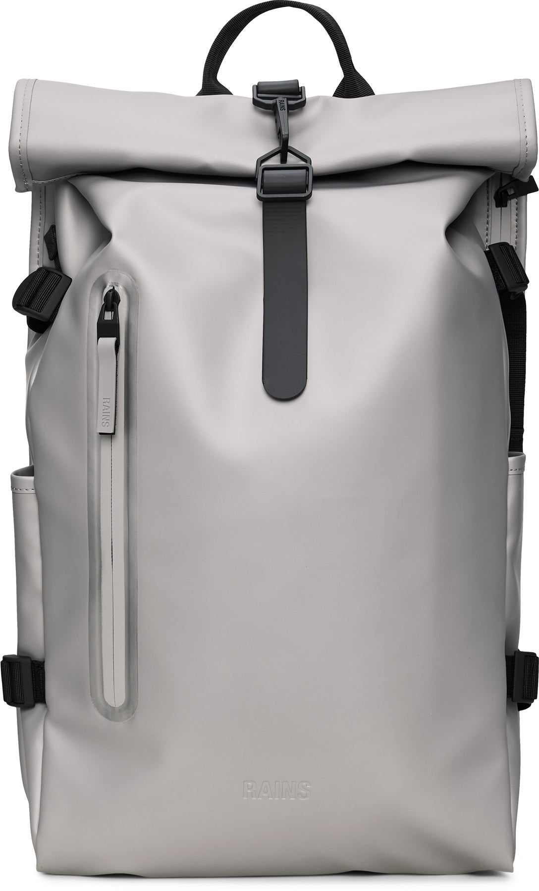 Rolltop Rucksack Large is a dependable city staple. The design interprets Rains' most iconic Rolltop Rucksack with larger proportions and additional functionality. Rolltop Rucksack Large is carefully designed to keep precipitation out when traveling from point A to Z. To protect essentials from rain, fold the rolltop into a tight scroll and secure using the signature carabiner. Open the rucksack to reveal a single main compartment. Exterior features include a side-access laptop pocket, front pocket with coated zipper and two side slip pockets. Cycle-ready features include a front D-ring-ideal for holding bike locks-and a buckle-fastened chest strap for a secure ride-proof fit. Rolltop Rucksack Large is cut from Rains' signature waterproof PU fabric, engineered for carrying strength, durability and a smooth feel.